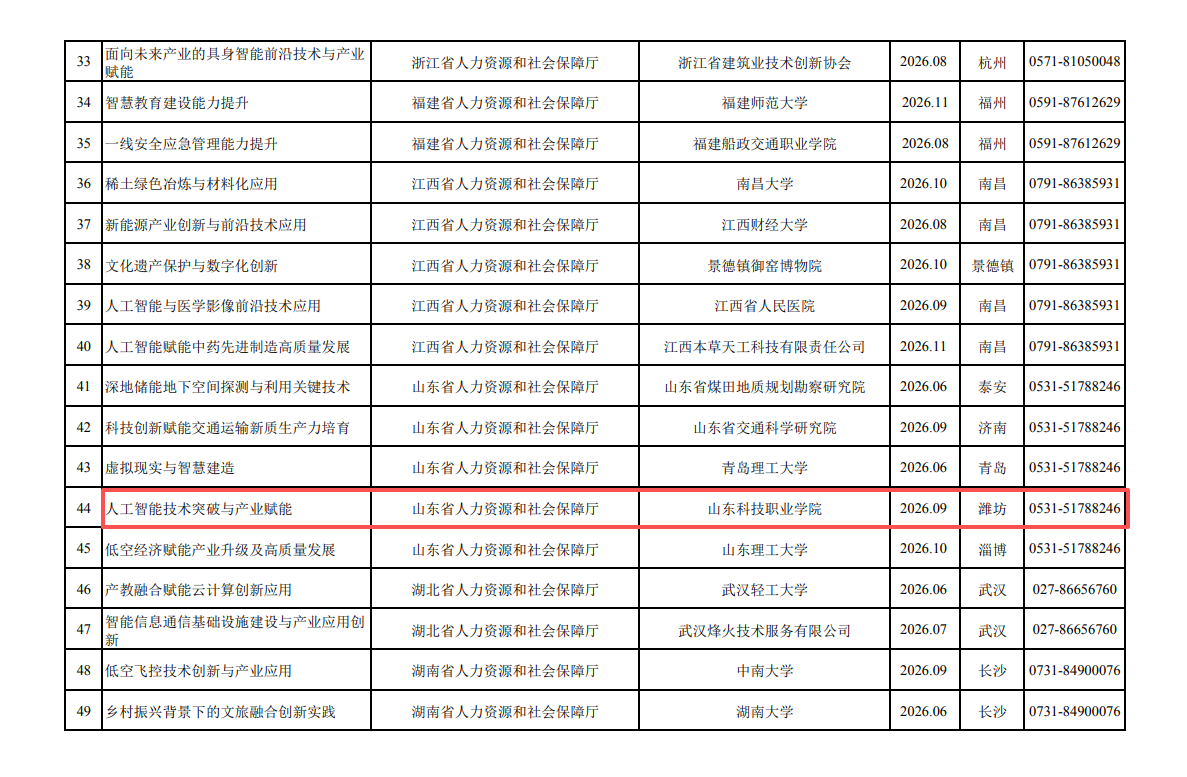 近日,人力资源社会保障部办公厅印发专业技术人才知识更新工程2026年高级研修项目计划。山东科技职业学院申报的《人工智能技术突破与产业赋能》项目成功入选。这是山东省本年度入选的7个国家级高级研修项目中唯一由高职院校申报的项目,标志着学校办学实力与人才培养成效再获国家层面认可。
